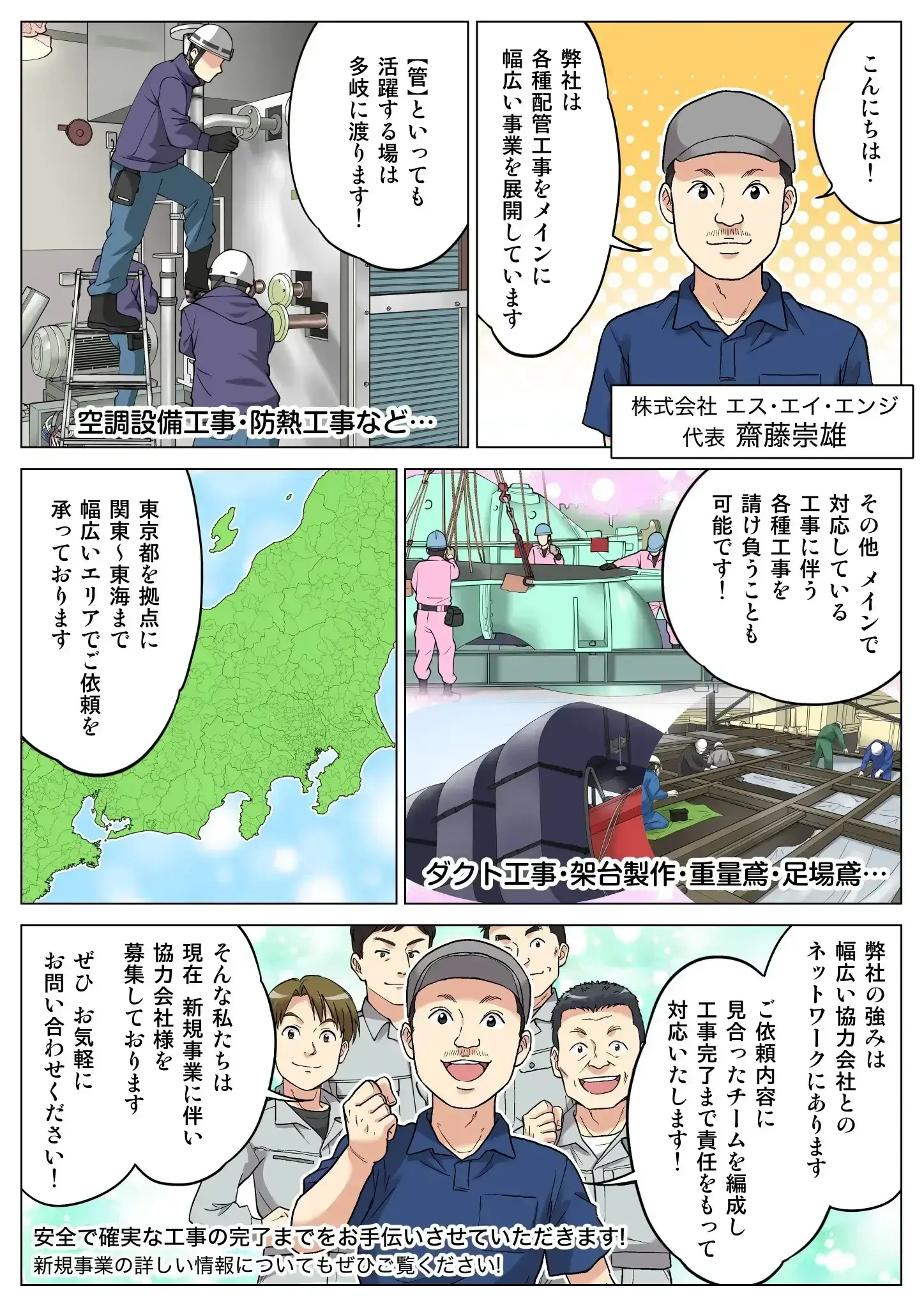 エス・エイ・エンジは関東エリアから東海エリアを中心に全国各地の配管工事、空調設備工事、機械据付、プラント設備など幅広く対応しております。創業10周年を迎え、さらに柔軟な対応力、豊富な施工実績を強みに配管工事や空調設備工事をメインに建設および設備関連の工事に対応してまいります。